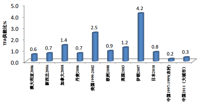 我国北京、广州这样的大城市居民的反式脂肪摄入的供能比仅为0.34%,明显低于其他国家或地区,如美国反式脂肪供能比是我国大城市的8.3倍(1997-2006),日本为2.7倍(2010),伊朗为12.4倍(2007),英国为3.5倍(2003),欧洲为2.6倍(2000),丹麦为2.1倍(2006),澳大利亚为1.8倍(2006),新西兰为2.1倍(2006),加拿大为4.1倍(2008)。