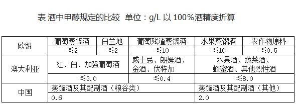 以最近新发布的蒸馏酒及其配制酒中的甲醇规定为例,我国的甲醇指标是基于对我国饮酒人群的饮酒情况的科学评估和我国生产流通的蒸馏酒及其配制酒的产品进行大量采样分析基础之上的,既能够保障我国饮酒人群的健康,又符合我国生产流通的产品实际情况,与其他国家的相关规定则不完全一致具体指标规定见表。