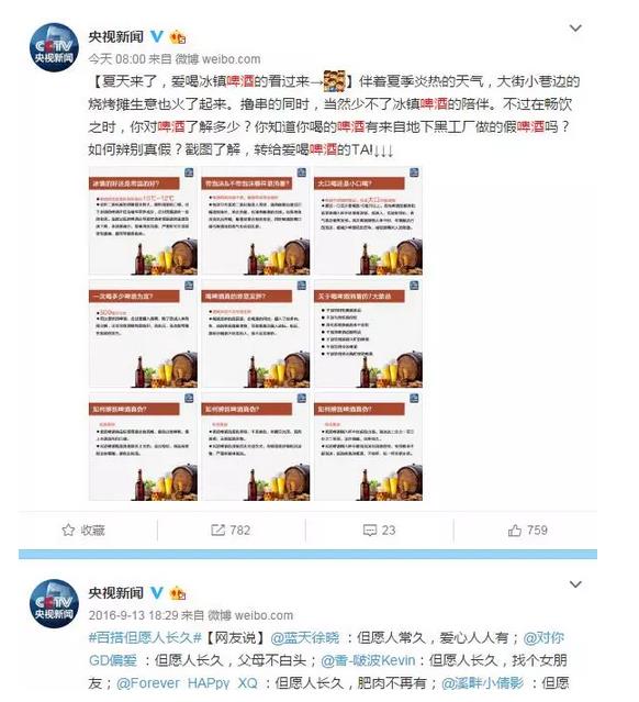 倒是中国新闻网最近发过一个假啤酒的微博。