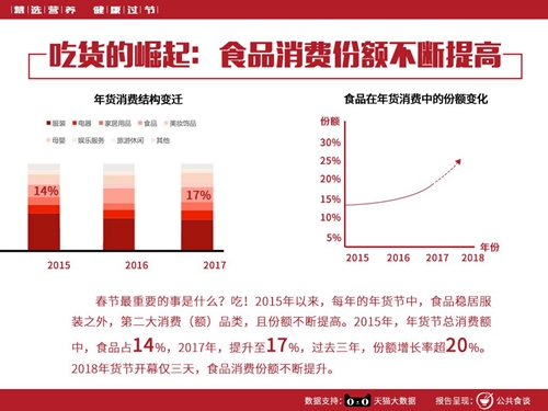 食品与营养信息交流中心副主任钟凯介绍,2015-2018天猫年货节大数据显示,食品一直是服装之外,年货节消费的第二大品类,且消费额占比不断提升;公众在线采购的食物种类,也日趋多样化。