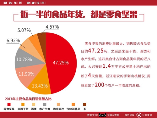 大数据显示,在食品类的年货消费上,零食坚果消费量最大,占比高达47.25%。也就是说,现代人买年货,在吃方面,近一半的钱花在以各色坚果为代表的零食上。