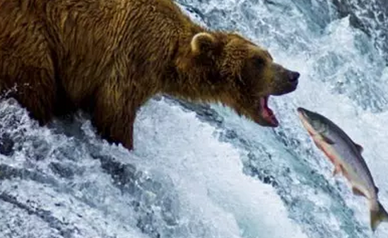 《动物世界》里,在溪流边捕食的棕熊就是在吃大马哈鱼。