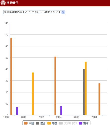 北京时间3月6日晚间消息,据世界银行收集的数据,可得出金砖5国完全母乳喂养率柱状图。统计周期为1998-2008年,调查为每年选择一些国家进行,因此各国均只有个别年份的数据。俄罗斯无数据。