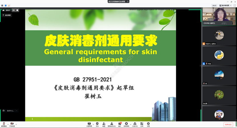 山东省疾控中心主任崔树玉从修订背景、修订过程和标准内容等方面对 GB 27951-2021《皮肤消毒剂通用要求》进行了详细解读。百余名专业机构专家和行业代表参加会议。