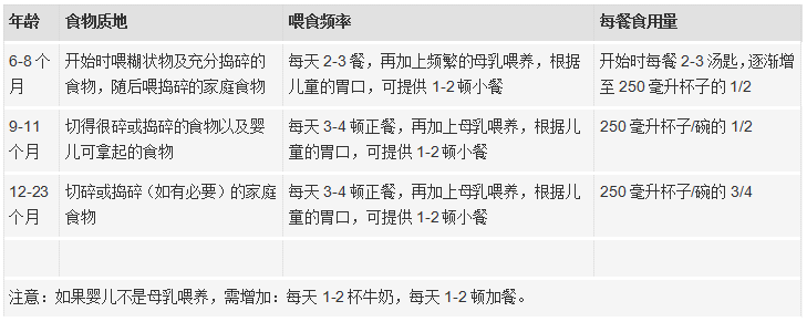 世卫组织建议婴儿在6个月大时(180天)开始接受除母乳之外的补充食物。食物应当是适当的,也就是说应当提供足够的能量、蛋白质和微量营养素以满足儿童生长的营养需求。应当以安全的方式制备和喂给食物以便尽量减少污染的危险。喂养婴幼儿需要给予积极的照护和激发以便鼓励儿童进食。