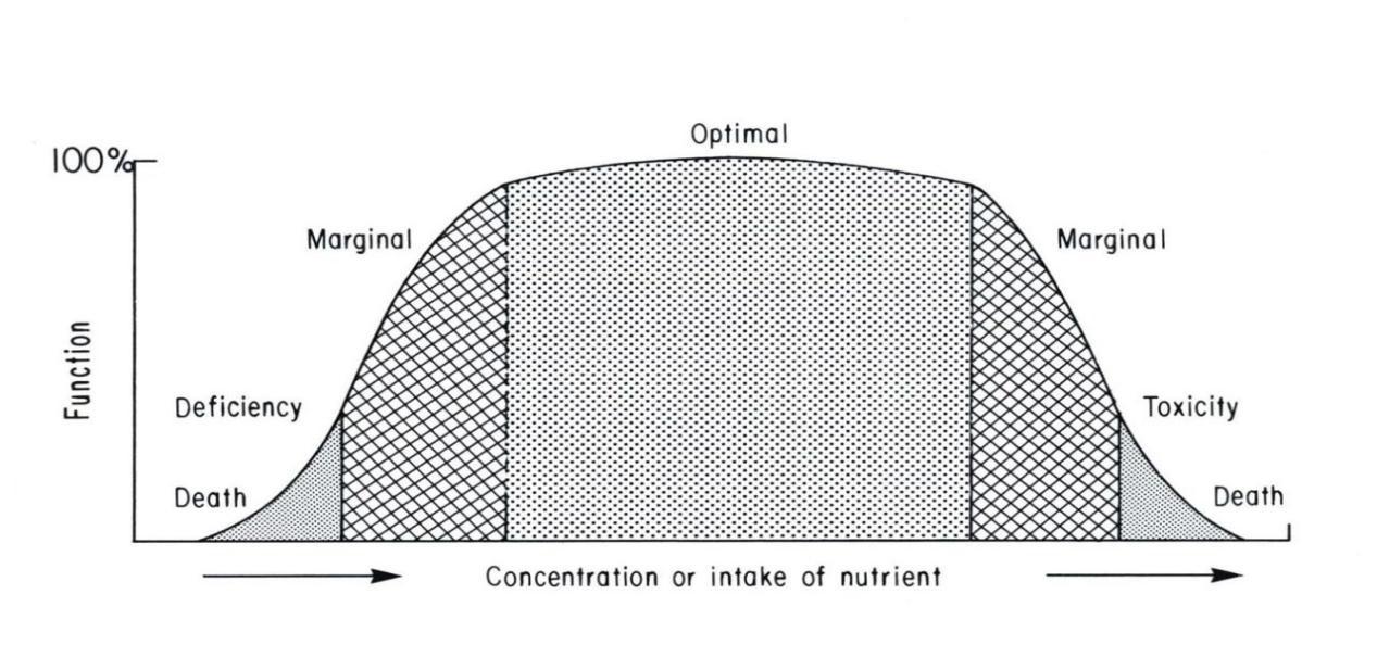 各种营养成分对健康的影响,都是一个钟形。也就是说,缺乏的时候,对健康不利;但是太多了,对健康也不利。我们常说的“过犹不及”,就是这个道理。在“充足”和“太多”之间,不同的营养成分缓冲范围不同。有的范围很宽,比如维生素 C,一个 1 到 3 岁的孩子每天 15 毫克就足够了,但是多到 400 毫克也没有副作用。而 15 毫克维生素,只需要一个中等大小的桔子或者猕猴桃就足够了,很多蔬菜也含量很高。这就意味着,只要孩子的饮食习惯不是很离谱,就不会缺乏维生素 C。当然,如果喜欢,再吃进几百毫克也不会有害。而有的成分缓冲范围比较小。很典型的比如锌,1 到 3 岁的孩子每天 3 毫克就足够,而 7 毫克是“安全上限”。这种情况下,盲目地给孩子“补充”锌,超过安全上限、从而危害孩子的可能性可能跟锌不足的可能性一样大。
