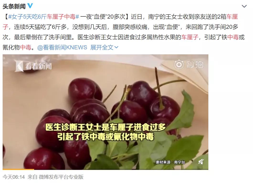 1月25日,有新闻爆出一女子5天吃6斤车厘子中毒,一夜“血便”20多次。