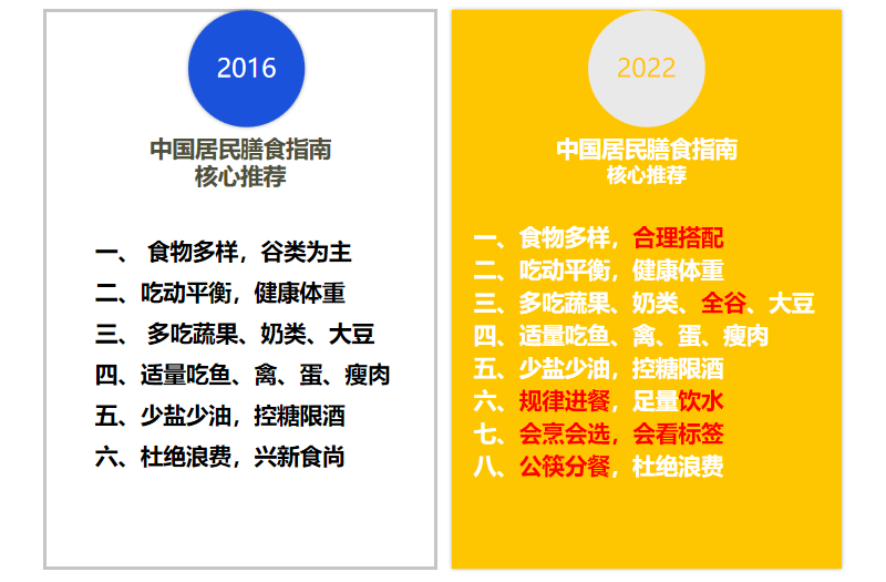 今天最新的《中国居民膳食指南(2022)》发布,与上一版的指南相比,也有了一些变化,包括核心 8 条提示、增加了新的建议,大家可以看下图 :