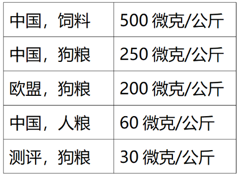 食品有真菌毒素限量,饲料也有。比如中国通用的《饲料卫生标准》中的ZEN限量是500ppb(即微克每公斤),《宠物饲料卫生规定》中成犬饲料的ZEN限量为250ppb。网上有些人对“产品符合(中国)国家标准”嗤之以鼻,更推崇欧美标准。但是最保守、最严格、动物福利最完善的欧盟的标准,狗粮ZEN的限量也是200ppb,和中国差不多。