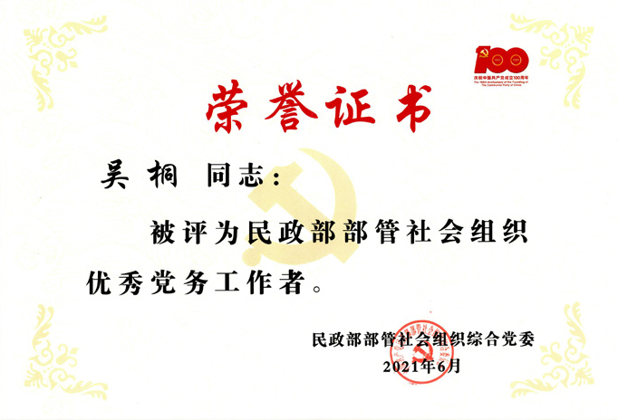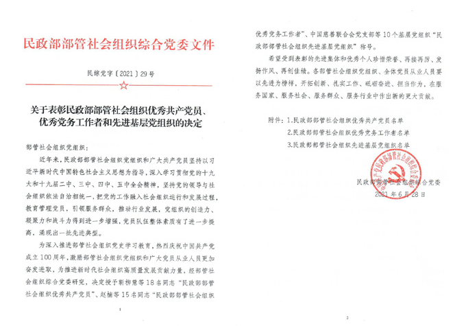 为深入推进部管社会组织党史学习教育,热烈庆祝中国共产党成立 100 周年,激励部管社会组织党组织和广大党员从业人员更加奋发进取,为推进新时代社会组织高质量发展贡献力量,6 月 29 日,民政部部管社会组织综合党委在京召开部管社会组织庆祝建党 100 周年暨党建工作经验交流会。会上,部管社会组织综合党委宣读了授予