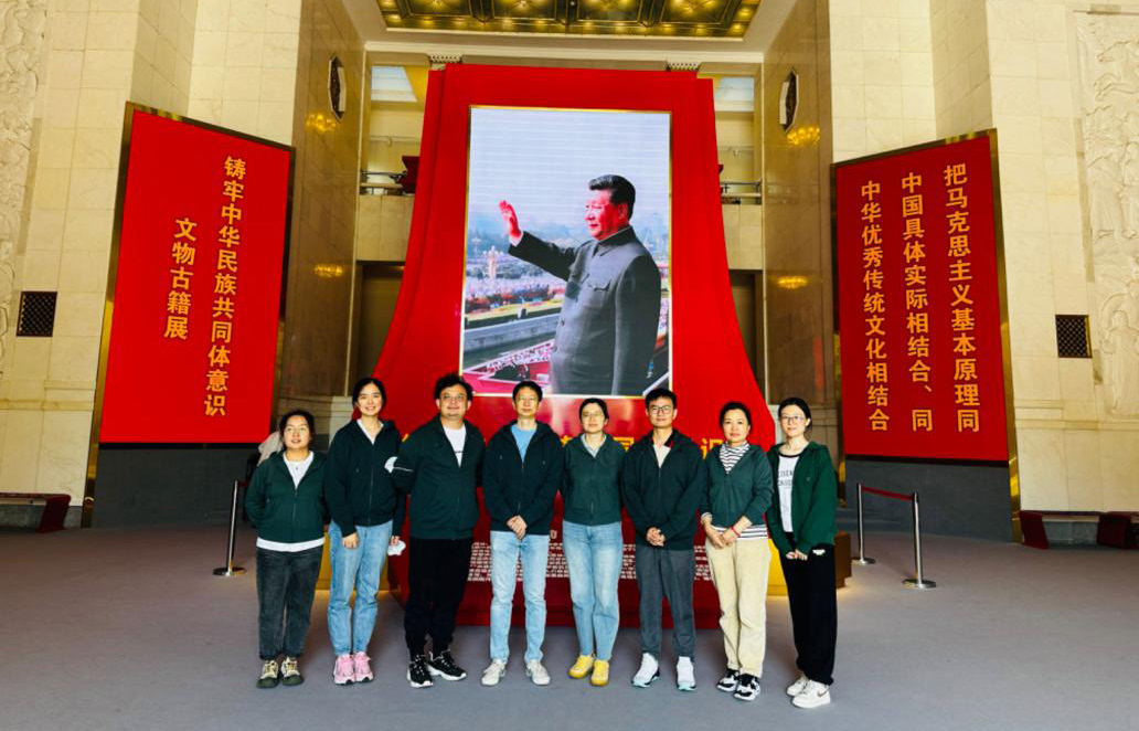 为庆祝中华人民共和国成立 74 周年,认真学习贯彻党的二十大精神和习近平新时代中国特色社会主义思想,继续创新推进支部党建实践活动,丰富学习形式,推动党建与业务深度融合,以学促干,讲好中华民族共同体故事, 中心党支部开展“赞祖国 共筑中国梦 迎国庆 抒发爱国情 ”主题党日活动。2023 年 10 月 13 日上午, 中心党支部组织中心全员赴民族文化宫,集体参观国家民委主办的“铸牢中华民族共同体意识文物古籍展”。