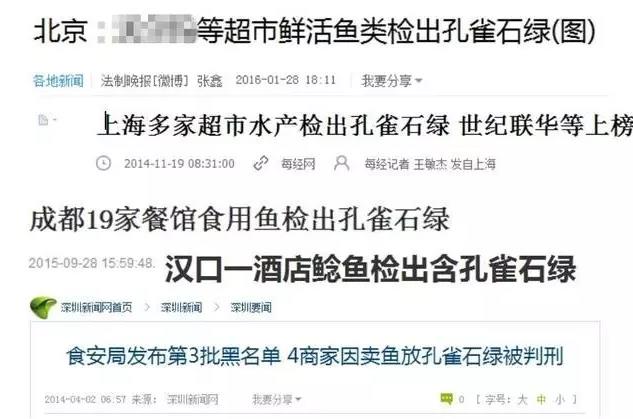 随便在网上搜一下就能找到很多相关报道。无论大超市、小市场还是餐馆酒店,都有孔雀石绿的身影,即使是北上广深这样的监管相对完善的一线城市也难以幸免。