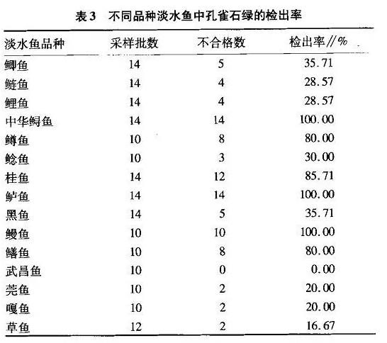 辽宁省食品检验检测院在2013年对180份水产品的检测表明,50%以上检出孔雀石绿(其中约30%符合欧盟标准2微克/公斤),鳟鱼、鲈鱼、鳜鱼、鳗鱼、鳝鱼、中华鲟等价格高的鱼种问题比较突出。