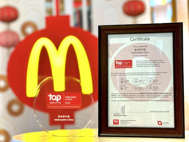 2023年1月17日,上海,麦当劳中国获得由杰出雇主调研机构(Top Employers Institute)颁发的“中国杰出雇主 2023”认证。麦当劳中国以“绿色增长引擎”为驱动力,加速业务高质量增长,持续为未来培养下一代人才。在杰出雇主调研机构聚焦的六大领域中,麦当劳中国获得了广泛的认可,尤其在业务战略、数字化 HR 和绩效管理上表现出色,第十三次获得此项殊荣。