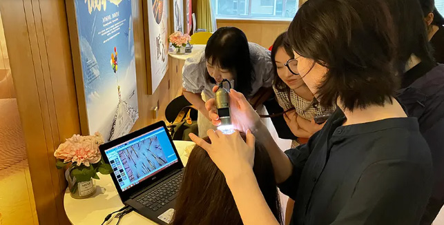 现场还设置了消费者自测和医生头皮检测的两项体验环节:消费者可通过手机打开 AI 小程序对头皮头发自拍,即刻判断健康度;同时,脱发治疗医生在现场使用专业头皮镜,为消费者检测头皮。医生通过观察放大后的头皮、头发状态,判断有无脱发及脱发的严重程度和类型。