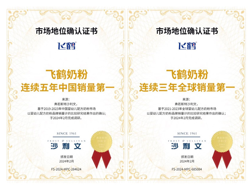 近日,国际权威调研机构弗若斯特沙利文,向飞鹤颁发多项“第一”认证证书。认证信息显示,2019 年 -2023年度,飞鹤奶粉在中国婴幼儿配方奶粉市场(不含港澳台地区)连续 5 年位居第一,在全球婴幼儿配方奶粉市场连续 3 年销量第一。同时,旗下星飞帆系列早已成为婴儿奶粉品类全球第一大单品。近五年飞鹤营收实现15% 以上的复合增长,继续保持创新发展,在研发驱动下技术与品质持续升级,获得市场认可。