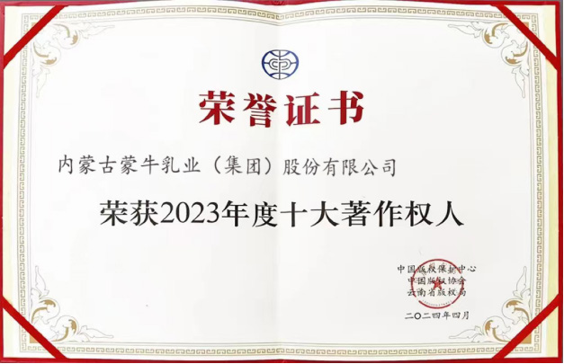 4 月 23 日,由中国版权保护中心、中国版权协会和云南省版权局等联合主办的“2023 年度十大著作权人”发布会在云南昆明成功举办。会上,蒙牛集团荣获“2023年度十大著作权人”荣誉称号,为行业首个获此殊荣的企业。