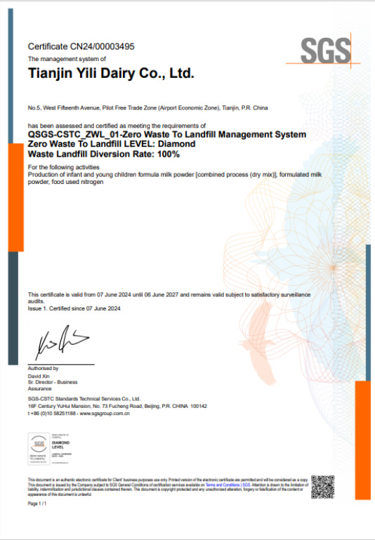 伊利集团首家“废弃物零填埋工厂”诞生!伊利集团婴幼儿营养品事 业部天津伊利乳业有限责任公司获得由全球领先的认证机构 SGS 颁发的“废 弃物零填埋管理体系:钻石级”认证证书。