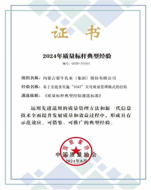 8月15日,中国质量协会正式发布“2024 年质量标杆典型经验”,蒙牛集团提报的“基于全链条实施‘1643’天穹质量管理模式的经验”被评为“2024 年质量标杆典型经验”。