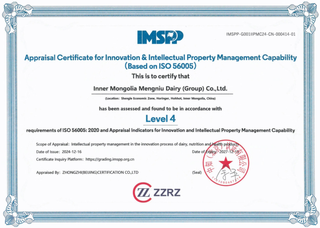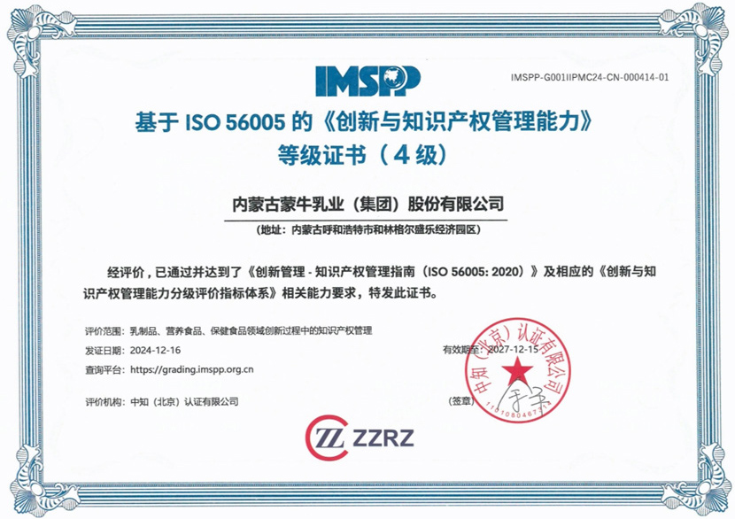 12 月 16 日,蒙牛集团获得 ISO 56005《创新与知识产权管理能力》四级认证,成为中国乳制品、营养食品与保健品行业中首批获得四级认定的企业!
