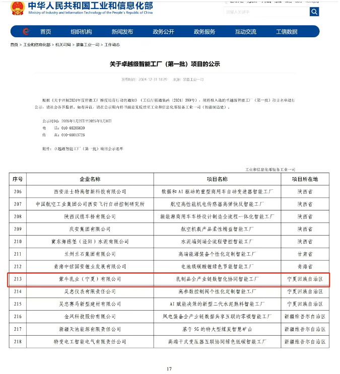 国家级认可!蒙牛宁夏工厂入选工信部首批卓越级智能工厂