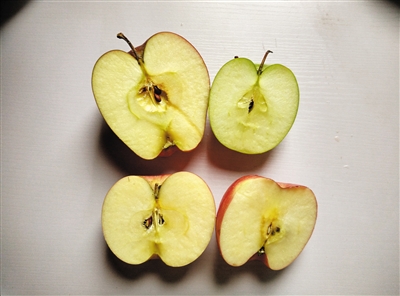 图3及图4为四种苹果刚切开和切开五小时后对比。左上为蛇果,右上为青苹果,下面两种均为富士苹果。