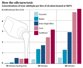 报道中引用了英国德蒙福特大学生物分析化学和化学病理学教授马丁•格鲁特维尔德(Martin Grootveld)的研究数据。这位研究者把不同种类的烹调油分别加热,并测定了其中“致癌毒物”醛类物质的含量变化。研究的结论是,相比橄榄油、椰子油和黄油,葵花籽油和玉米油在高温长时间烹调之后会产生更多醛类物质。