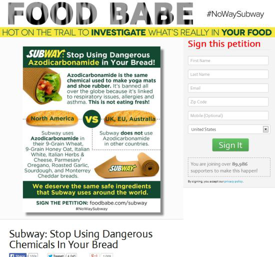 这份请愿书中提到,美国的赛百味面包中,都含有一种叫做偶氮甲酰胺的食品添加剂,但欧洲、澳大利亚和世界其他地区却没有。并指出,偶氮二酰胺是用来做瑜珈垫,鞋底,它不应该是食物。请愿书最后还提出“美国人要吃真正的新鲜食物——而不是瑜伽垫”。111