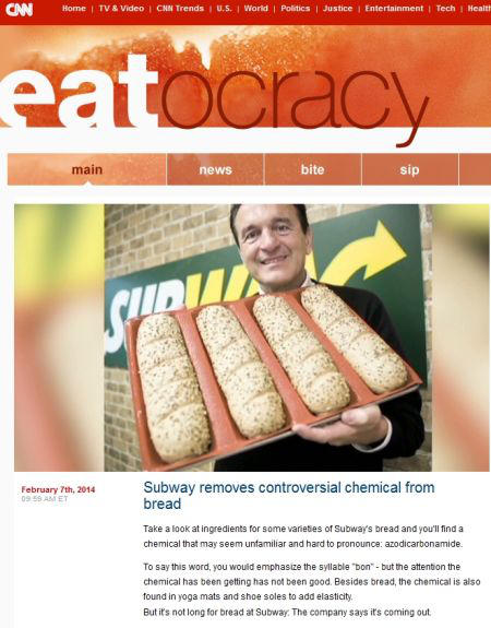 5、2月11日,京华时报刊文,援引食品专家董金狮的观点称“在中国、美国同样都允许使用偶氮二甲酰胺作为食品添加剂的情况下,赛百味美国公司使用了该物质,而中国公司声明根本未使用,显然难以让中国消费者信服。”文章对赛百味中国的回应提出了质疑。