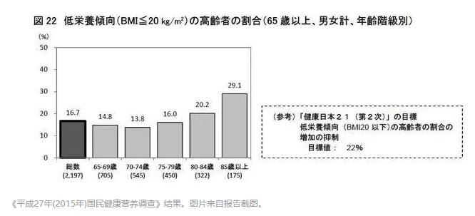 网上流传的文章称,据日本厚生劳动省《平成27年(2015年)国民健康营养调查》,每五位80到84岁的老人就有一位被归为“低营养族群”,85岁以上老人有1/3没有摄取足够营养。长期的营养不足,可能降低认知机能,甚至让死亡风险倍增。