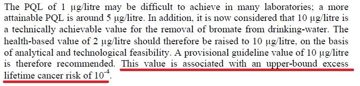 这是WHO制定饮用水中溴酸盐标准的文件。红线部分是说:如果终生饮用溴酸盐含量为所推荐标准的水,一生下来增加的得癌症的可能性上限是是万分之一。按一个人70岁来算,每年增加的得癌可能性是10万分之0.14。也就是说,WHO认为这个风险是可以接受的。实际上,饮用水中的溴酸盐是消毒时产生的——如果认为这个风险不可接受,那么可以不采用这种消毒方式。
