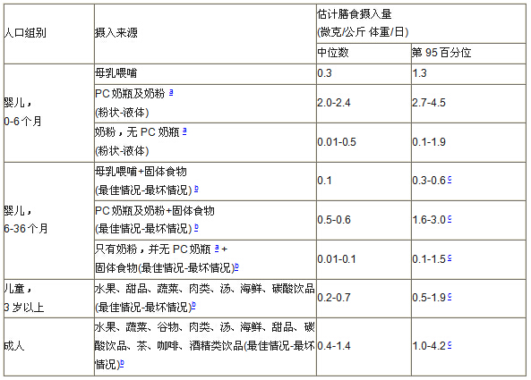 33. 2010年举行的粮农/世联合专家会议估计了国际水平双酚A的摄入量。专家把各种可能出现的膳食模式考虑在内,包括最坏膳食模式(包装食品占总膳食100%)和最佳膳食模式(包装食品占总膳食25%),并从特定文献取得食品的双酚A浓度数据,从而计算出摄入量估值。16 粮农/世卫联合专家会议得出各年龄组别的国际水平摄入量估值,均远低于由欧洲食品安全局定立的每日可容忍摄入量,每公斤体重0.05 毫克。这显示从目前双酚A的摄入量来看,各年龄组别面对的健康风险极低。表1总结了四个人口组别的估计膳食摄取量。
