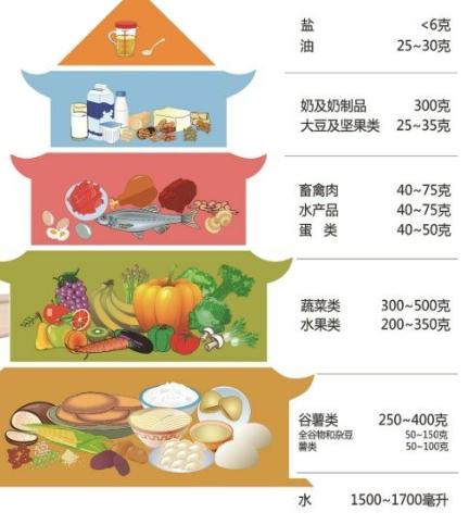 蔬菜保证每天摄入300至500克,深色蔬菜应占1/2;水果保证每天摄入200至350克,果汁不能代替鲜果;奶制品摄入量相当于每天液态奶300克;豆制品每天摄入量相当于大豆25克以上,适量吃坚果。