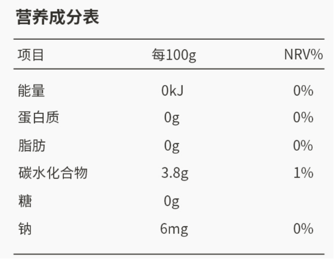 2. 看营养成分表。营养成分表会标注每100毫升产品中碳水化合物的含量及能量情况。部分食品或饮料的营养成分表会单独标注“糖”的含量,这有助于消费者判断所购买产品是否真正为“0糖”。
