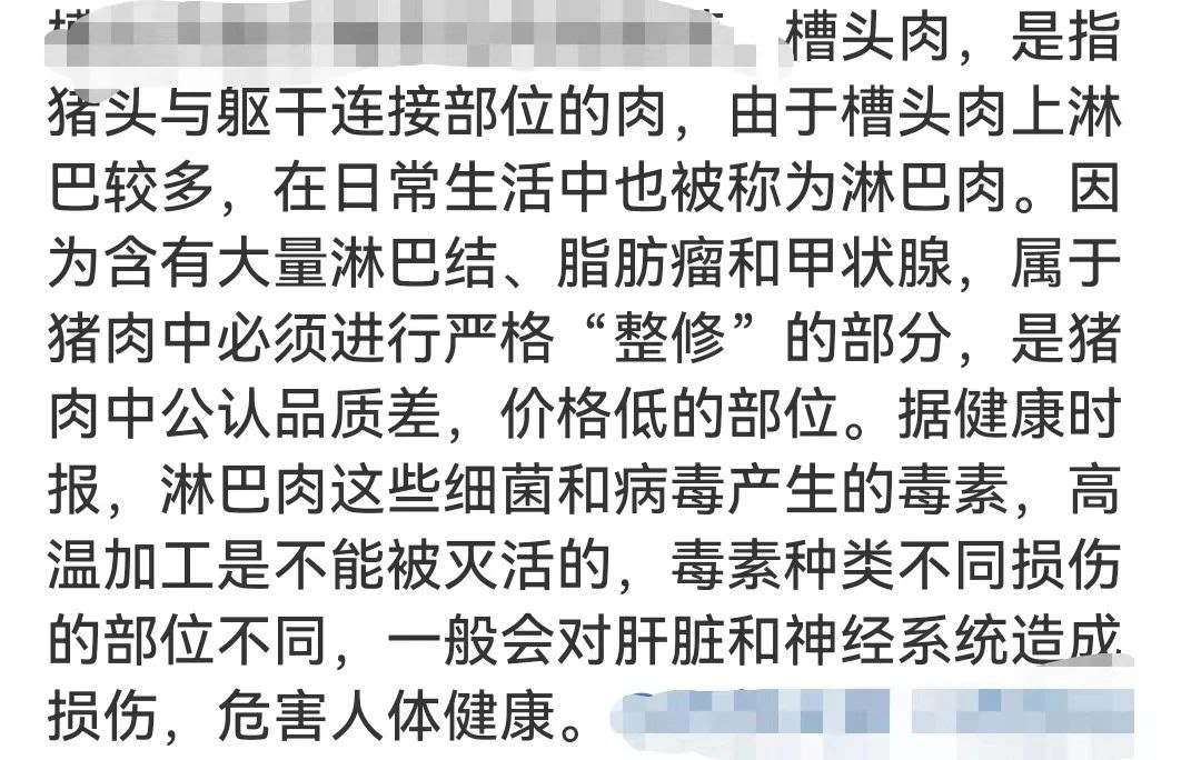 到今天,各路自媒体、新媒体、传统媒体,纷纷“科普”槽头肉。比如,下面这段话,几乎就是这些“科普”的标准说法 :