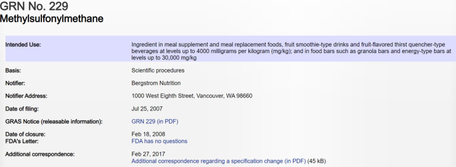 MSM 并不是新东西,它天然存在于人体以及动物体内,包括果蔬在内的植物中也广泛存在,甚至 在海洋空气中都能检测到。美国 FDA 曾于 2007 年对 MSM 的食用安全性进行评估并将它列为 GRAS 物质, 即“通常认为是安全的”,有点类似于中国的新食品原料。
