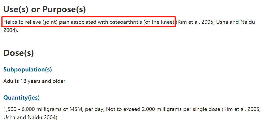 比如韩国规定使用 MSM 的产品可以标注“可能有助于关节和软骨健康”。在加拿大,MSM 可以用于“缓 解骨松带来的膝盖疼痛”。或许这也是网传“MSM 是止痛药”的源头,但实际上它的缓解疼痛作用和止