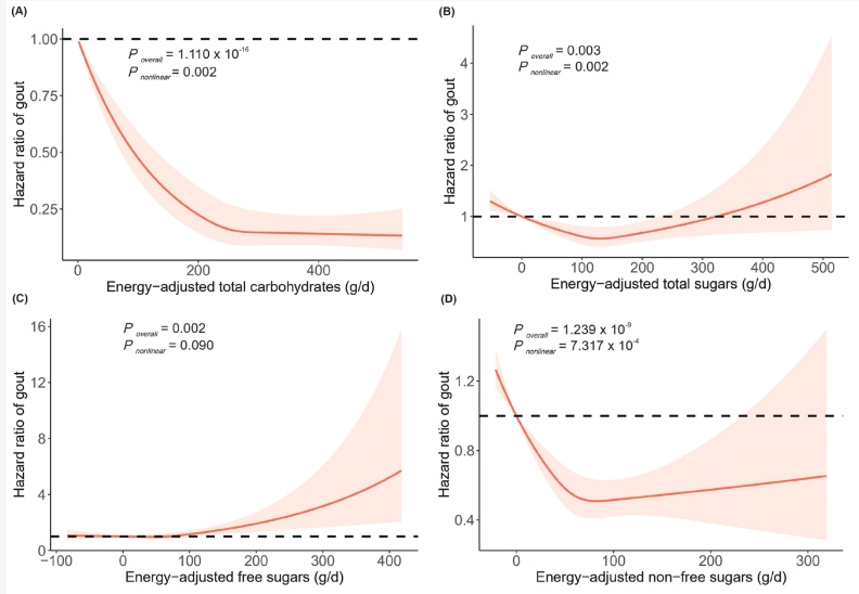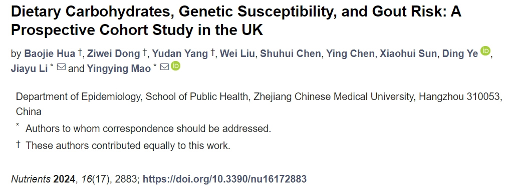 一 项 我 国 学 者 发 表 于Nutrients 杂志上的流行病学研究(图 1),分析了膳食碳水化合物摄入与痛风风险的关系。