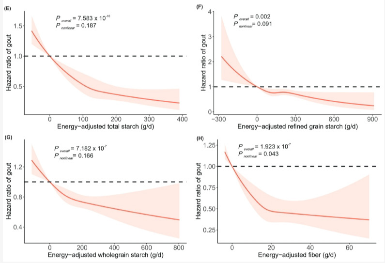 4 在能量摄入相同的情况下比较,无论是总淀粉、精白谷物来源淀粉还是全谷物来源淀粉,在淀粉总量增加时,痛风风险都呈现下降趋势。膳食纤维摄入量增加也有类似趋势。