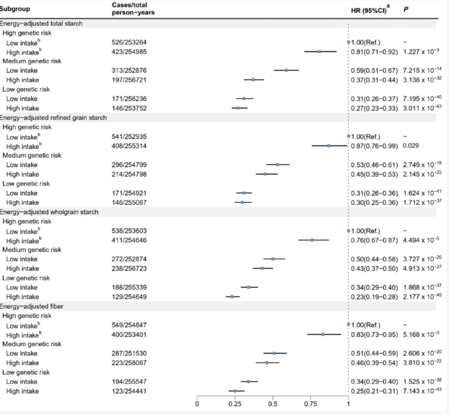 无论是遗传高风险还是低风险的人,多吃淀粉都与痛风风险降低的趋势相关(数据点在中线左边意味着风险减少)。