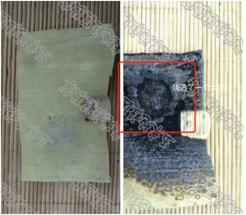 但所谓的“1500度烧不透”其实只是巧妙地蒙蔽了读者。实际上,在另外一张图片中,我们可以看到面皮被烧出了一个很深的洞,之所以没有烧透,其实只是因为所用的面皮比较多、比较厚罢了。