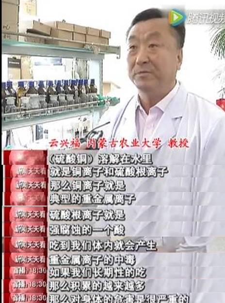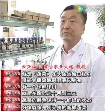 经专家鉴定,这种蓝色痕迹是一种叫硫酸铜的化学药剂,很可能是商贩在运输途中用来防腐保鲜的,而且用过硫酸铜的菜也会显得更绿。