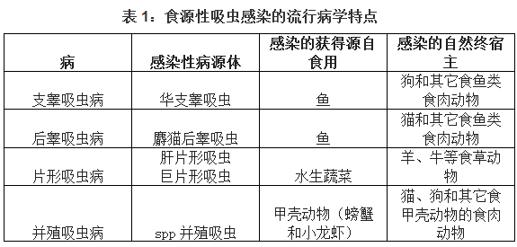 人们通过食用带有幼虫期微小寄生虫的生或者没有煮熟的鱼、甲壳动物和蔬菜而获得感染(见表1)。